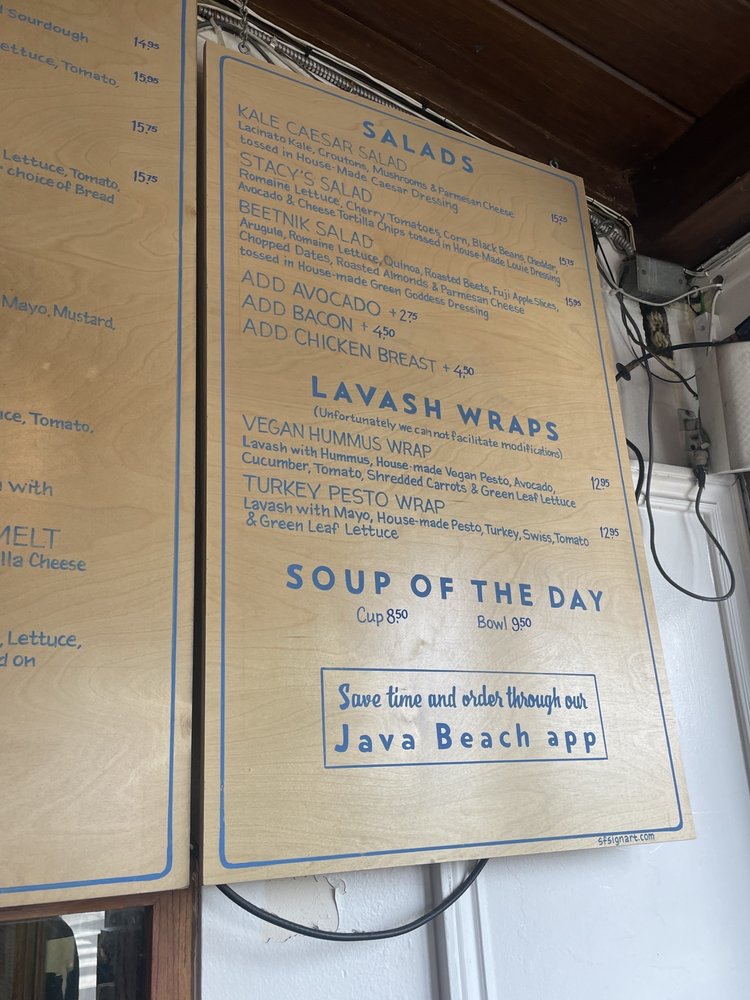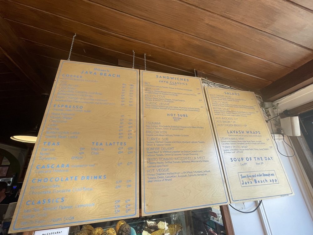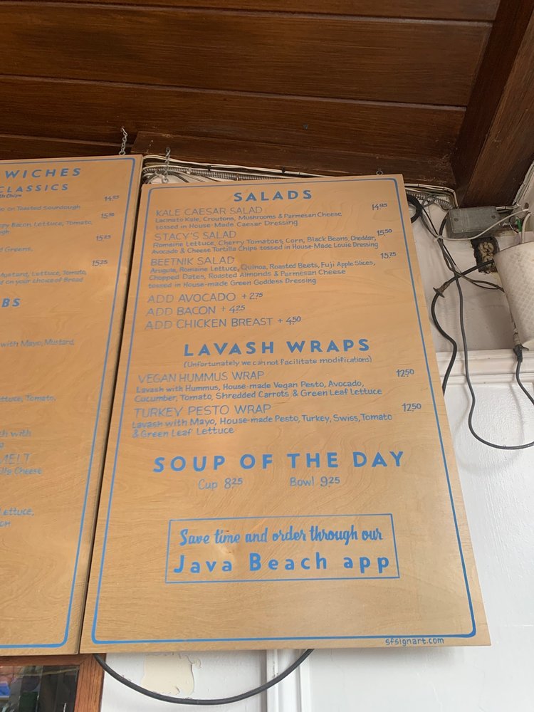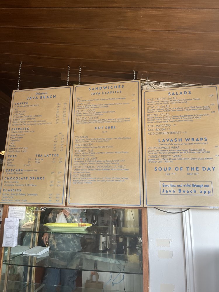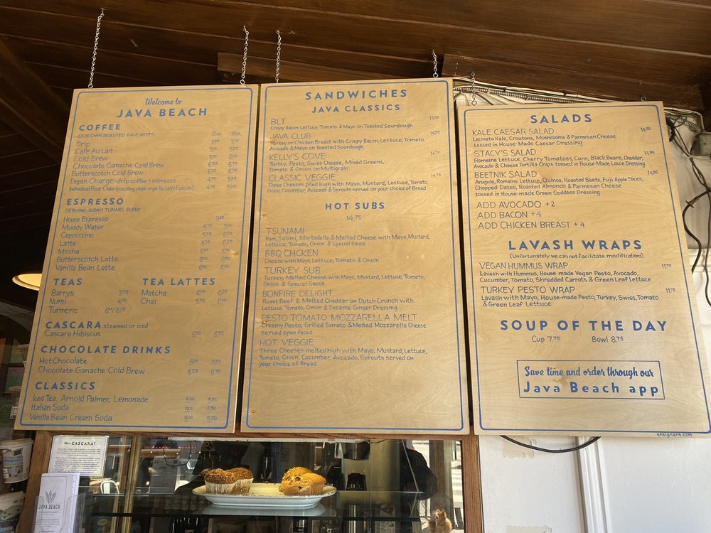“ For just about as long as I can remember, Java Beach has seemingly held a special place in the hearts of so many people on this side of the city. The cynical part of me has always attributed it to the fact that there aren't exactly a ton of alternatives out here, but really, I just never got it. However, now that I've been? I totally get it. It's not the trendiest of spots, nor is it the biggest, but there's no question that it fits the neighborhood so well. Of course, it doesn't hurt that the food and coffee here actually isn't too shabby. Every time I've been, it always feels like I've been transported somewhere else along the coast. Whether it be the smell of the ocean, the cold breeze, or the surfers who wander in throughout the day, it definitely feels more like you're in Pacifica or Half Moon Bay than SF. In general, the vibes here are just different from most other places in the city - they've even got a small "bar" with a handful of beers on tap. As for the rest of the menu, the coffee offerings are pretty typical of a neighborhood coffee shop (though, they do have some interesting varieties of lattes), as are their display case full of baked goodies (all locally sourced). Their hot menu, however, includes some enticing items, even if they aren't ridiculously unique, such as several types of breakfast burritos, hot subs, sandwiches, Irish soda bread, and lavash wraps. -- HOT TSUNAMI SANDWICH - Ham, Salami, Mortadella, and Melted Cheese (Swiss) with Mayo, Mustard, Lettuce, Tomato, Red Onions, and Special Sauce on a French Roll...$17.50 Not that I ever expected this to be bad, but it was way better than I thought it would be. I always wish sandwiches had more meat, but this was packed as is. What's more, the veggies added a nice bit of freshness and tasted great with their special sauce. -- TURKEY SUB - Turkey and Melted Cheese (Pepper Jack) with Mayo, Mustard, Lettuce, Tomato, Red Onions, and Special Sauce on Dutch Crunch...$16.75 Pretty solid, though, the Hot Tsunami is better (it has some of my favorite cuts and more meat). While it's not freshly roasted Turkey (a la Arguello Market's), the slices of turkey are thick and plentiful and I loved the Dutch crunch bread. The one unfortunate thing that has come up is that sometime before my most recent visit, not only has Java Beach's prices crept up, but their potato chips (which were quite tasty) are no longer included with their sandwiches either (you can still it for an added cost). Sign of the times to be sure, but it still makes their sandwiches a bit pricey, understandable or not. As for drinks, their regular HOUSE DRIP COFFEE ($3.75 for 12 oz) is pretty good and decently strong, but my go-to order has actually been their ARNOLD PALMER ($6.50 for 16 oz), which is always refreshing with just the right sweetness. Given how popular they are in the neighborhood, getting a table inside can be a challenge at times, but sitting outside or in their parklet is definitely the way to go when the weather is nice. Somewhat similarly, finding nearby parking is really easy as well, which makes Java Beach a super convenient spot whenever my friends who live nearby want to meet up. Like I said, we totally get it now! ”