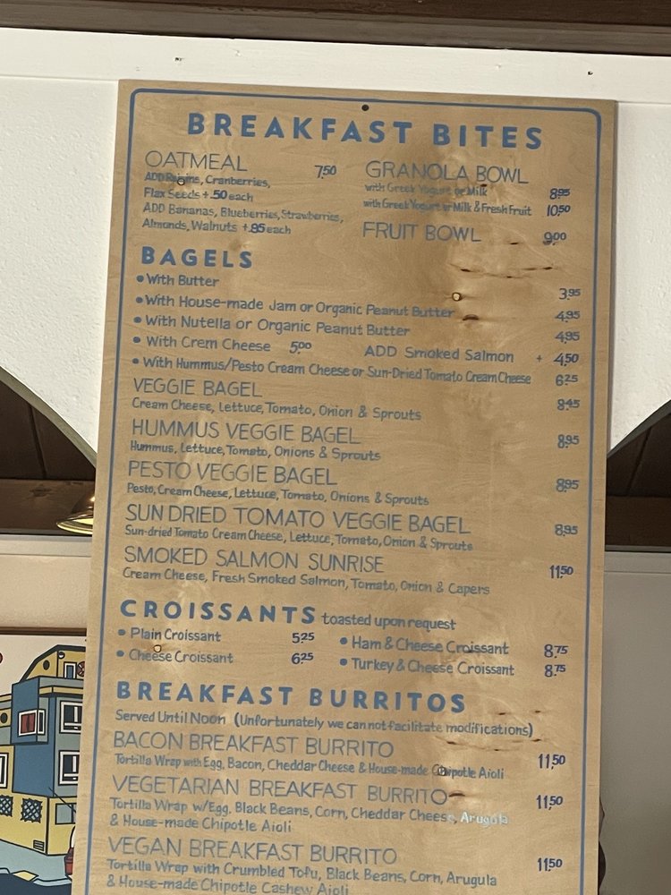 “ This is an interesting location. I'm in Ocean Beach traveling down whatever road that parallels the highway and I reach in Judah end of the line Muni stop. and I need to use the restroom. I really wanna go over to the beach, but I need to use the restroom and it's 7 o'clock in the morning and it's the perfect spot. I just need a little bite of you so I settle for an everything bagel with cream cheese. i've already had a good size coffee, but I decide to try their coffee since you know I'm at a coffee shop in San Francisco to Ocean Beach. They have a nicely decorated cup and a nice table in which to sit and enjoy good Wi-Fi all the things looks like it doubles as a bar later on but anyway, all in all is good experience and just a chill location give it 4 1/2 stars out of five ”